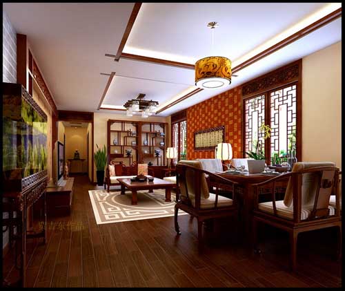 客廳空間相當(dāng)?shù)拈_明,摒棄了傳統(tǒng)的隔斷,在客廳與飯廳之間沒有任何的隔斷,材質(zhì)上也都選取了比較古色古香的木質(zhì)材料。