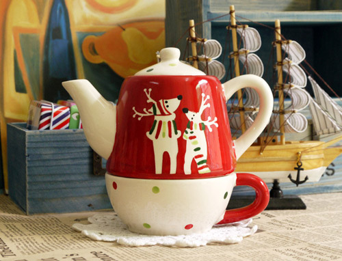 2.耶誕風(fēng)呀,小麋鹿呀 歐風(fēng)濃烈的代表物哦!紅與綠的搭配以及可愛的小麋鹿充滿了耶誕感!正紅撞乳白的色調(diào)也讓人心情為之一亮。非常萌的茶壺下部配有方便而可愛的茶杯(緊貼桌面的就是了),一整套的靚麗組合一定讓你整個(gè)冬天都過得暖暖的喲!