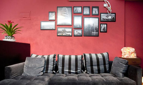 亮點:灰色的沙發(fā)遇上紅色背景墻,熱情中帶著一絲沉著,加上植物的小小綠色點綴,營造出強烈的視覺效果。