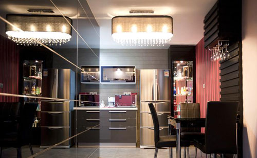 亮點:餐廳的一面墻用反光內墻磚裝修,使空間得到放大,另一面紅色的墻紙暖意十足。