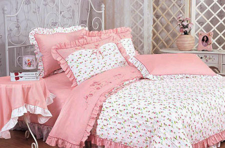 很獨到創(chuàng)意的工藝,花邊枕套自然打锏和很巧妙的蝴蝶結設計,顯得很有美感,感覺很有活力, 被罩一改傳統(tǒng)的做法,本款集中國的專家級設計師之手,本款被罩在花型款式的設計上,設計師下了很大的功夫,被子的四周鑲嵌了一道荷葉邊,顯得富有整體感。