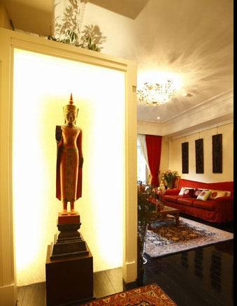 屋主從柬埔寨帶回來的佛像經(jīng)過設(shè)計(jì)師空間搭景,佛像展現(xiàn)了慈藹神圣的意象,讓藝術(shù)品不單只是藝術(shù)品,而是渲染靜謐氛圍的小宇宙。