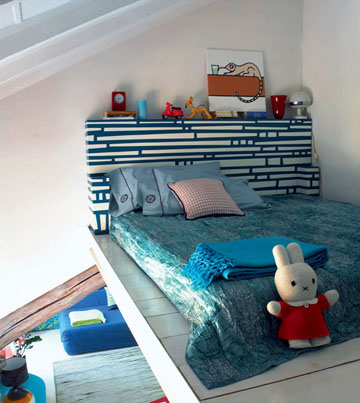 橫梁并沒(méi)有成為空間的障礙,巧妙的設(shè)計(jì)讓它成為空間區(qū)域的分割點(diǎn)。 艾比是一個(gè)環(huán)保主義者,在整個(gè)家居改造中他盡量都使用再生材料。艾比說(shuō),海洋中絕大部分氧氣和大氣中60% 的氧氣是浮游植物制造的,須鯨卻能消滅浮游植物的勁敵——浮游動(dòng)物。另外,齒鯨也有助于保持魚(yú)類的生態(tài)平衡。在閣樓的小小臥室里,艾比做著自己的海洋夢(mèng)。床頭是由木材制作的,整體的小邊墻行使了小空間中床頭柜的功能。床罩仿佛是帶著海藍(lán)波線的沙灘,對(duì)面漆成蔚藍(lán)色的墻面有艾比的作品鯨魚(yú)墻雕。抽象的圖形惟有那靈活的尾巴仿佛在告訴人們,鯨也擁有細(xì)膩敏感的身體和情感,外形龐大的鯨魚(yú)其實(shí)有時(shí)也是渺小的生物。 點(diǎn)擊圖片進(jìn)入下一頁(yè)>>