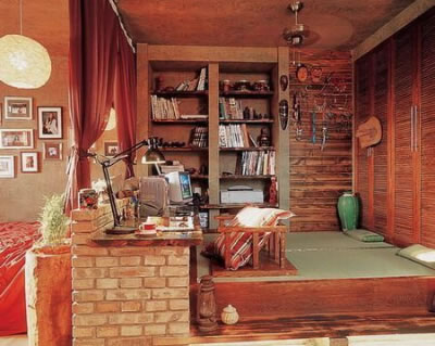 東南亞風(fēng)格客廳 整個房間沒有任何的隔斷,小空間的設(shè)計(jì)往往如此,針對的是單身貴族,完全從主人的角度出發(fā),考慮空間的劃分。 此空間既是一個書房,又是一個休閑區(qū)域,還可以客人來的時候當(dāng)成客臥,背后是一個更衣柜,正面是書架和陳列柜,塌塌米的框架和書桌都是由普通的紅磚壘成的,放上一把無腿的坐椅就是一個書房,仔細(xì)觀察塌塌米的下部是有燈光的,不光是一種裝飾,夜間的照明也可以滿足。