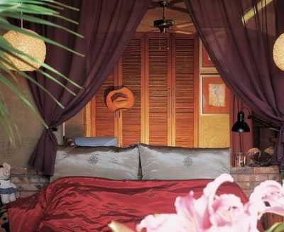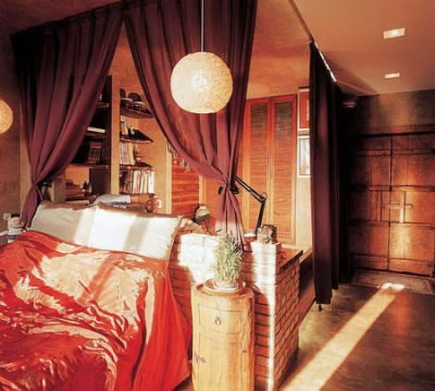 東南亞風(fēng)格臥室 公共空間的地面,是在水泥地面上刷的透明地面漆,這張圖片是從臥室看書房這個位置,如果留意,可以看出當(dāng)書房做為客臥時,兩面的拉簾可以封閉這個區(qū)域,設(shè)計(jì)當(dāng)中,充分考慮了主人做為使用空間的優(yōu)越性,也就是說,當(dāng)有客人來的時候,主人依然可以使用大部分的空間。 |