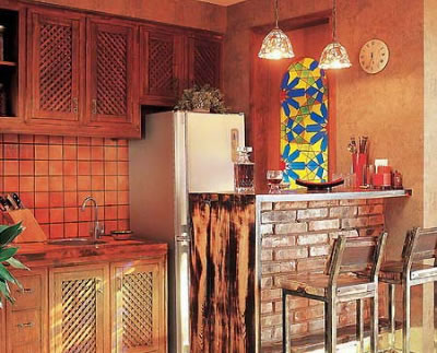 東南亞風(fēng)格廚房 敞開式的廚房,量身訂做的櫥柜,有以下幾個(gè)特點(diǎn): 1、制作櫥柜時(shí),預(yù)留出冰箱的位置,也就是說在設(shè)計(jì)時(shí)先了解冰箱的大小。 2、櫥柜的上方用吊頂?shù)霓k法來封閉,使之與櫥柜一體化。 3、櫥柜臺(tái)面用烘干木板直接制作,是在考慮到戶主不經(jīng)常做飯的前提下,一種風(fēng)格統(tǒng)一又經(jīng)濟(jì)實(shí)惠的選擇。仔細(xì)留意餐桌,提升了高度,既可就餐,又是一個(gè)吧臺(tái),整體的框架也是用紅磚砌成,踏腳的木板下方同樣設(shè)置了日光燈。 |