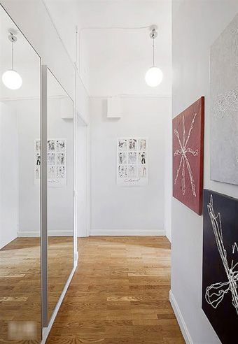 走進(jìn)臥室的走廊,屋主很有心地利用起來(lái),在這里做了一個(gè)大大的衣櫥,里面可以整齊地收納很多的衣物哦,鏡子柜面可以讓這個(gè)空間看上去還是大大的。另一邊的墻也沒(méi)有寂寞,白色、紅棕色、黑色的裝飾畫很有個(gè)性。