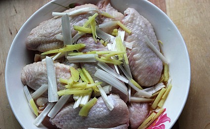 2.清洗干凈后剁開,加蔥姜、白酒腌半小時去腥