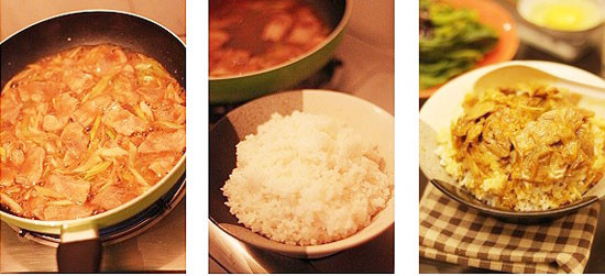 4.中火慢慢收濃醬汁后關(guān)火。如果醬汁太少,就加一些水,因?yàn)獒u汁要來(lái)拌米飯的嘛?墒且矂e太稀了嗯哈,又不是湯泡飯