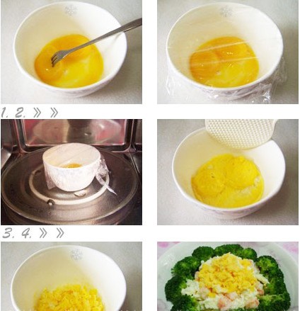 4、蛋黃可以用微波爐叮熟,也可以放入油鍋中炒熟打散,無(wú)論哪種方法,都盡量嫩一點(diǎn)。
