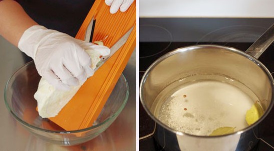 3.找個鍋,加入鹽10克、糖、杜松子,倒入500毫升水,燒沸,放涼備用