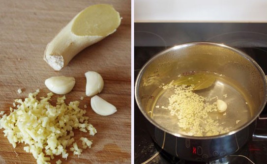 4.鹽水涼后,加入拍破的蒜瓣和姜末和白醋,拌勻