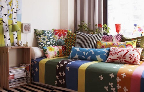 彩虹色自然過(guò)渡的條紋裝飾,使得床品整體簡(jiǎn)潔而具有動(dòng)感;與各類(lèi)花案明艷的靠包搭配,好像是在床上開(kāi)滿(mǎn)了五顏六色的花朵一般,如此繽紛如同把春天留在了臥室里。