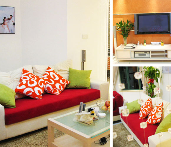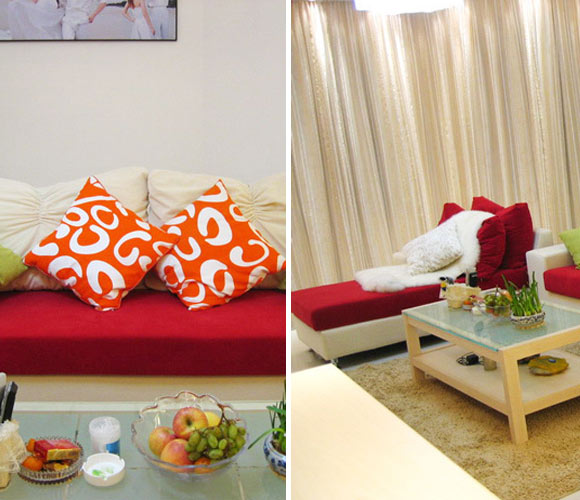 主人展示了橙色的抱枕,不時(shí)流露出新婚的喜悅感。