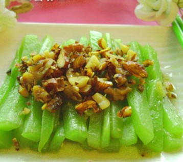 做法: 1、萵筍切成長條形,果仁切成碎粒,姜切成丁,橄欖油一勺,少鹽;