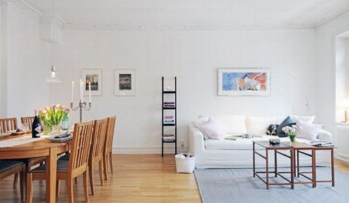 餐廳與客廳相連,是小戶型設計的一大特色。布局簡單又有豐富的層次感。木質(zhì)的餐桌和時尚的客廳,有著親密的和諧氣氛。餐桌上,一瓶酒、一束鮮花和一個燭臺,都是制造浪漫的元素?蛷d也不再孤單了。