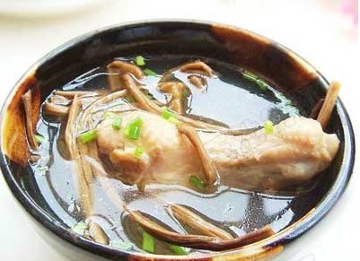 原料:雞腿4-5個、茶樹菇50克、姜一塊、小蔥一把、鹽、白胡椒粉。
