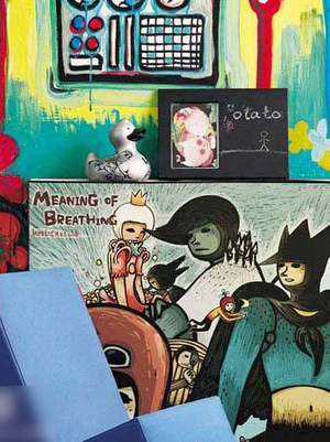 藍色的小巧沙發(fā)十分經(jīng)典,配以用于涂鴉的小黑板、銀色的涂“鴨”,還有動漫味十足的掛畫等小面積的涂鴉元素,使得居家環(huán)境頗具后現(xiàn)代意味。
