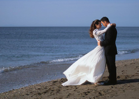 要展現(xiàn)美麗的身形,建議新人們在拍攝時多擺側(cè)身的pose,尤其是新娘,因為女性的身形美在微微側(cè)轉(zhuǎn)身體時更容易表現(xiàn)出來,如果純粹正面對這鏡頭,就顯得過于呆板,如報名照一般。究竟側(cè)身需要是轉(zhuǎn)多少角度呢?放心,攝影師會幫你掌控。 招數(shù)四:暗暗用力挺直腰部 拍婚照是件力氣活,因為你需要每時每刻讓身體的各個“部件”都處于高度“警覺”狀態(tài)。尤其是要背一定要暗暗用力,如果平時習(xí)慣性彎腰駝背會讓你覺得放松舒適,哪此時更要留意,因為松松垮垮的要背造型會讓照片拍出來極不自然,過于懶散、隨意也不適合隆重的婚照。而且挺直身體可以讓你的脖子、鎖骨、手臂等線條更有立體感,更漂亮。