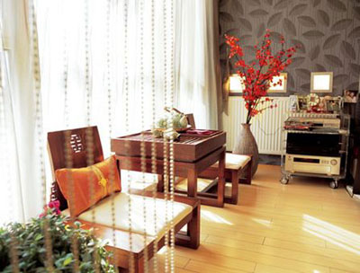 客廳一角,精美而袖珍的情侶中式椅和小茶幾,是主人在居住了一年后,為居室布置的一處“新景點(diǎn)”。灰色墻面上的方形燈光設(shè)計(jì)新穎別致。