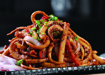 原料: 鮮魷魚(約1000克),紅尖椒末15克,綠尖椒末15克,香菜末10克,洋蔥末15克。調(diào)料蒜蓉辣醬30克,白糖5克,海鮮醬油10克,蠔油20克,鹽4克,味精2克,色拉油1500克,干淀粉30克。 做法: 1、將整只的鮮魷魚剝?nèi)ネ獠亢谝,將頭拽下,將腹腔內(nèi)的內(nèi)臟和海螵鞘去除,然后將魷魚的眼睛用剪刀挖出來,洗凈即可。 2、將洗凈后的魷魚身和頭部控水,放入海鮮醬油、10克蠔油腌漬20分鐘后均勻地裹上干淀粉,下入燒至六成熱油中小火浸炸3分鐘至表皮酥脆撈出,控油。 3、將控好油的魷魚放入案板上,將腹腔由頭到尾改刀成間距為1厘米的魷魚圈后連同頭一起放入盤中。 4、鍋內(nèi)留油20克,燒至七成熱時放入蒜蓉辣醬、白糖、10克蠔油小火翻炒均勻,再加入紅尖椒末、綠尖椒末、香菜末、洋蔥末、鹽、味精調(diào)味后制成蒜椒醬,趁熱出鍋。 5、鐵板大火燒3分鐘,取出后將切好的魷魚放在鐵板上,澆上調(diào)好的蒜椒醬即可上桌。