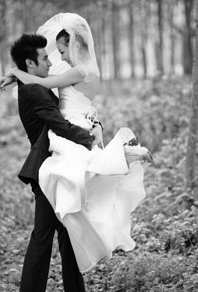 很可愛的一張婚照,新郎黑色的休閑禮服搭配黑色褲子,很有洋氣的感覺。新娘身著白色抹胸式的小禮服,將新娘襯托的更加的嬌小動人,新娘的頭飾也讓這組婚照具有濃濃的浪漫味道。