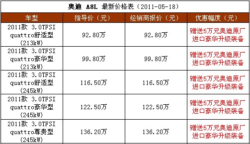 近日,中從溫州聯(lián)奧奧迪4S店了解到,5月16日—6月16日期間在聯(lián)奧奧迪4S店定購新奧迪A8L,將獲50000元奧迪原廠進口豪華升級裝備;同時,老客戶介紹新客戶購車即可獲得1000元售后服務(wù)代金卷。店內(nèi)有現(xiàn)車,感興趣的車友可以到店看車,車型價格詳見下表: