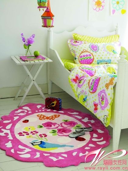 圓形設(shè)計兒童地毯,適宜放在臥室,色彩鮮艷的牡丹花鳥圖案定為成為房間的視覺中心。
