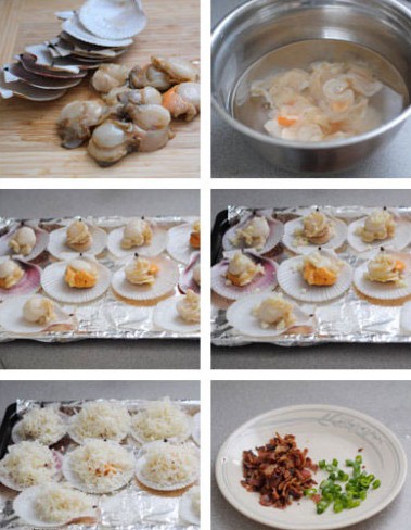 6、培根煎熟,放涼后捏碎,蔥切碎。把培根碎和蔥花撒在烤好的扇貝上。完成!
