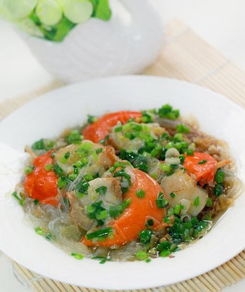3、將粉絲鋪在盤底,放上日月貝,撒上少量料酒,撒上姜蒜末,淋入適量蒸魚豉油。