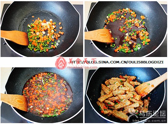 6、鍋中少許油燒熱,油熱后,下蒜薹和胡蘿卜煸炒,放入蔥花爆香,倒入料汁,小火加熱,料汁冒泡后,加入炸好的切條下鍋翻炒,使每根切條均勻裹滿料汁即可。
