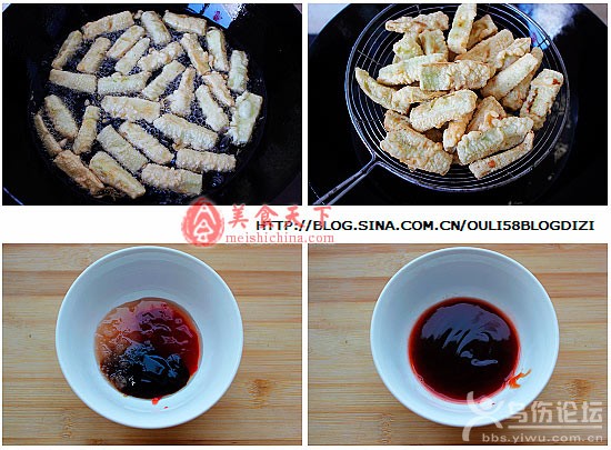 4、鍋中油燒至六七成熱,將沾滿面糊的茄子放入鍋中炸,炸至茄子金黃酥脆即可撈出控油。 5、一勺番茄醬、一勺醋、一勺蠔油、3勺糖,2勺水調(diào)成料汁(這里的勺是指5毫升)胡蘿卜、蒜薹切丁、蔥花切碎備用。