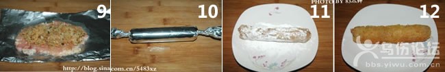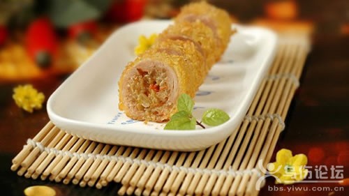 食材:雞琵琶腿 2只、糯米 130g、胡蘿卜 1小根、干香菇 10朵、榨菜 45g、鹽、黑胡椒、蠔油、醬油 1.糯米洗凈加水蒸成糯米飯 2.榨菜,胡蘿卜,和泡好的香菇分別切碎備用 3.把雞琵琶腿去骨去筋,用肉錘或刀背敲打到至原來的兩倍大 4.抹上料酒,撒少許鹽,胡椒粉稍腌 5.熱鍋上油,下香菇煸香 6.倒入胡蘿卜和榨菜碎翻炒 7.加入糯米飯,調(diào)入蠔油,醬油,和胡椒粉,翻勻 8.把腌好的雞腿理順,平鋪在大塊錫紙上 9.在雞肉正中間放上拌好的糯米飯 10.連錫紙一起卷起,捏緊,上鍋蒸20分鐘左右至熟 11.取出剝?nèi)ュa紙,把蒸好的雞肉卷依次裹上生粉,蛋液和面包糠 12.入油鍋炸至表面金黃,起鍋瀝油,切片即可 小貼士 1.雞腿去骨時盡量把筋也去掉,以免蒸的過程中收縮影響賣相。 2.糯米飯粘性很大,步驟7的時侯,如果拌不均勻,可以試著加少許泡香菇的水進去,但是用水量要盡可能的小。 3.炸雞肉卷的時侯注意火侯,炸好的東西出鍋后顏色會加深。所以,當雞肉卷的顏色比你想要的淺一度時出鍋最好。 |
