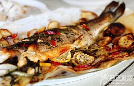食材:小三文魚 1.5kg左右,整條的、小土豆 幾個,新季、現(xiàn)磨海鹽 適量、現(xiàn)磨黑胡椒 適量、新鮮茴香球莖 1~2個、初榨橄欖油 適量、新鮮蒔蘿葉 1小捆、新鮮龍嵩葉 1小捆(我用的是Texas tarragon)、檸檬 1個、新鮮辣椒 1顆(這個是我自己加的,懶人可以忽略) 1. 把烤箱溫度調(diào)到“最高”進行預(yù)熱(bake檔) 2.把檸檬輕輕刨下薄薄的皮屑,與一半的蒔蘿葉,一半的龍嵩葉,一起剁碎備用龍 3.土豆刮洗干凈,切薄片龍 4.茴香也切片龍 5.然后把它們均勻鋪在墊有2層烤紙的烤盤里,磨些海鹽和黑胡椒,并淋少許橄欖油備用龍 6.把三文魚刮去魚鱗(買來的時候就已經(jīng)是清理好內(nèi)臟魚鰓什么的了),洗干凈龍 7.然后用廚房紙巾里里外外充分擦干水分龍 8.并用刀在魚的兩面都割幾條口子龍 9.魚肚子里磨些海鹽和黑胡椒龍 10.魚身的口子里也磨些海鹽和黑胡椒以便入味龍 11.把先前的檸檬香草碎塞進魚身的口子里龍 12.把剩下的另一半的香草,以及刨過皮的切片的檸檬塞進魚肚子里龍 13.把整條魚放在土豆上,撒上辣椒片,撒些現(xiàn)磨海鹽和黑胡椒,再淋些橄欖油龍 14. 把烤盤放進已經(jīng)預(yù)熱到“screaming hot ”的烤箱里,烤10~15分鐘,然后把溫度降至180攝氏度,再10~15分鐘,檢查魚是否烤熟的方法:拿一只干凈的簽字,插進去魚肉最厚的部位(大概就是魚頭后面一點),數(shù)10下,然后取出,放在嘴唇上感受一下,如果是暖暖的,就說明已經(jīng)烤好了 15. 吃的時候,再擠少許新鮮檸檬汁在表面,淋少許橄欖油 |