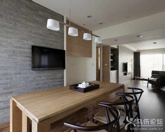 設計重點:電視主墻 編輯點評:選用板巖磚鋪排的電視主墻面,自然的窯變色澤拼接,帶出空間的人文氣質。
