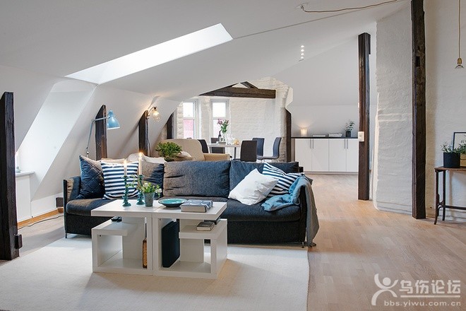 | 這個不尋常的87平米閣樓公寓位于美麗的瑞典,公寓擁有三間臥室,以及獨(dú)立的廚房與衛(wèi)生間。非常有型的設(shè)計(jì)使得整間公寓看起來比實(shí)際的面積大很多。別致的木制房梁、白色的優(yōu)雅廚房,三個好我是,一貫明亮的色彩,這就是專屬于你的印象世界。通風(fēng)良好的客廳是公寓的心臟所在,它將所有的空間聯(lián)系在了一起。斜面的天花板,迷人的房梁,還有天窗為人們提供了美麗的景色與充足的光線。主人房擁有絕對完美的設(shè)計(jì),步入式壁櫥提供了充足的儲存空間,而鄰居則變成了天空。每天醒來,你可以享受早晨最溫柔的陽光,并享受美麗的城市景觀。 |