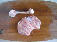 1 準(zhǔn)備好雞腿4個(gè),沖洗干凈。 2 取一個(gè)雞腿,如圖在小頭一厘米的地方,用刀劃斷一圈。 3 把雞腿肉多的一面朝下,肉少的一面朝上,用刀子劃開(kāi)。(買來(lái)的雞腿基本都是斜刀口的,所以肉會(huì)一邊多一邊少,先切開(kāi)肉少的那邊比容易) 4 然后沿著雞腿骨慢慢把肉分離。 5 最后在盡頭處切斷,這樣完整的雞腿骨就剔出來(lái)了。 6 依次剔好四個(gè)。 7 把去骨的雞腿切成約1.5厘米見(jiàn)方的肉丁,放入大碗里。 8 調(diào)入烤肉料、烤肉醬和少許食用油。 9 戴上手套,抓勻,然后蓋上保鮮膜,入冰箱冷藏腌制2小時(shí)以上,我這個(gè)腌制了4小時(shí)。 10 竹簽提前用清水浸泡一下,然后串上肉串。(四個(gè)雞腿可以串8大串) 11 烤箱提前預(yù)熱好,230度,取一烤盤(pán),里面鋪上錫紙,放在烤箱的最下層,然后把肉串排放在烤網(wǎng)上,放入烤箱中層,烤約10分鐘,拿出來(lái)后撒上少許辣椒粉和孜然粉。(不吃辣可省略此步,原味烤出來(lái)就已經(jīng)很好吃)