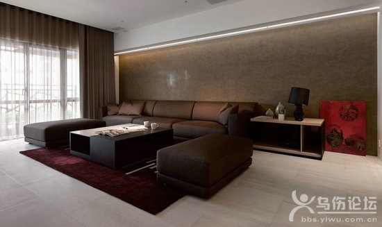 設(shè)計(jì)重點(diǎn):質(zhì)材運(yùn)用 編輯點(diǎn)評(píng):力求設(shè)計(jì)基調(diào)的平衡性,選擇有手工肌理的馬來漆為沙發(fā)主墻,以及仿石材的消光磚為地坪。