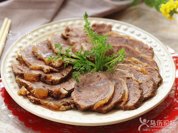 材料:牛腱子肉1500克,甜面醬200克 調(diào)味料:鹽適量,蔥二段,姜3片,桂皮2小塊,八角2個,花椒一大勺,茴香籽一大勺,丁香一大勺,肉蔻2個,砂仁2個,香葉4片,白芷4片 做法: 1、牛腱子肉化凍后浸泡在清水里,中間需換水,我是泡了一上午,再清洗干凈; 2、所有的香料備齊,零碎的香料裝入茶包中,肉蔻用刀背敲裂; 3、冷水上鍋,放入牛肉,中火燒開;開鍋后,表面會有很多浮沫,用勺子撇出來; 4、浮沫基本撇干凈后,放入蔥姜和所有的香料; 5、放入 200克甜面醬,攪勻后蓋鍋蓋大火燒開,轉(zhuǎn)小火慢燉,一直燉到牛肉可以用筷子插透;這大約需要一個小時;最后,添加適量的鹽; 6、燉好的牛肉不要取出來,一直放在鍋里悶著,待完全涼透以后,取出牛肉,湯汁過濾到容器里;牛肉繼續(xù)放在湯汁里,入冰箱冷藏一晚; 7、第二天取出牛肉切片裝盤,湯汁收在保鮮盒里,冰箱冷凍,可以留作老湯啦。 啰嗦: 鹽的用量要根據(jù)自己的口味確定; 牛肉煮至用筷子插透就可以,時間長了肉會發(fā)柴; 醬牛肉的方子在網(wǎng)上有很多,都會用到黃醬,我這里還真沒有賣的,用甜面醬代替。 |