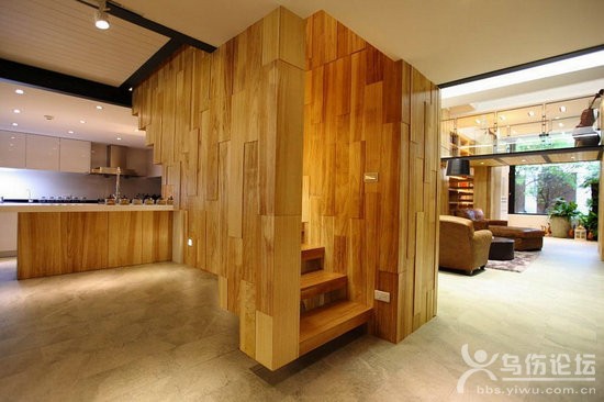 設(shè)計(jì)重點(diǎn):空間界定 編輯點(diǎn)評(píng):從玄關(guān)后方繞行而上的樓梯,不僅連接上方的閣樓與空橋,也界定公私場(chǎng)域。