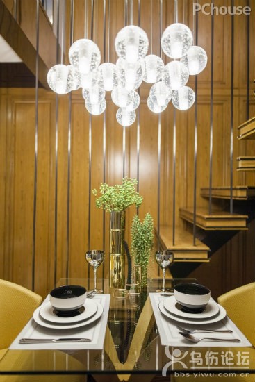 設(shè)計(jì)重點(diǎn):玻璃球形吊燈 編輯點(diǎn)評(píng):當(dāng)你站在樓梯上路過(guò)這道拐角的風(fēng)景時(shí),你會(huì)發(fā)現(xiàn)玻璃球形的吊燈從高空傾瀉而下,成為就餐空間的一道亮麗風(fēng)景,好不活潑!