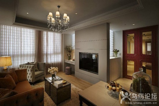 設(shè)計(jì)重點(diǎn):木紋柜體 編輯點(diǎn)評(píng):主臥書房里特別將書柜隱藏在書房背面,成為男主人私人藏書的角落。 案例二:100平現(xiàn)代標(biāo)準(zhǔn)格局空間 主要材料:訂制家具、訂制鐵件、訂制水晶燈、進(jìn)口布幔、進(jìn)口五金、大理石、柚木實(shí)木地板、進(jìn)口瓷磚等 充足的采光照亮一室的藝術(shù)色彩,更打破既有的空間隔閡。暖灰色系替整體打底上色,再施以粉色調(diào)的沙發(fā)、窗簾等軟件為風(fēng)格搭配,烘托優(yōu)雅恬靜的女性風(fēng)格,這道靈感則來自屋主兒時(shí)記憶與三五好友相聚的歡樂時(shí)光,透過設(shè)計(jì)手法將屋主重要的生命歷程,轉(zhuǎn)化為家居空間里一幕幕迷人的端景。另外,注重空間細(xì)節(jié)里每一道邊角的細(xì)致度,善用玻璃、鏡面與金屬質(zhì)感的亮面飾品,點(diǎn)亮軟裝的精致度,傾注優(yōu)雅的生活品味。