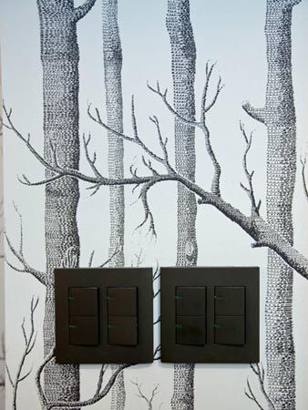 餐廳里白樺樹圖案墻紙+黑色的開關。
