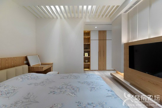 設(shè)計重點:雙向呼應(yīng) 編輯點評:梧桐木材質(zhì)的雙向呼應(yīng),于床尾段落利落收起更衣及衛(wèi)浴動線。 |
