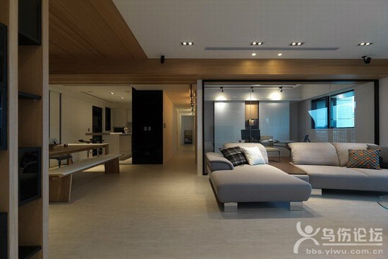 設(shè)計重點:利落線條 編輯點評:電視墻藉由立體線條勾勒壁面層次,柜體也以無把手設(shè)計創(chuàng)造干凈、利落的視覺美感。 4回頂部 案例二:200平現(xiàn)代大坪空間 主要材料:實木皮、玻璃、烤漆等 依循光源行進(jìn),木作天花轉(zhuǎn)折、導(dǎo)引出大公領(lǐng)域方向,寬適且方正格局在視野中逐步開展,簡練鋪陳而出的客廳,設(shè)計師運以布置思維,安排入屋主所鐘情的家私,襯以落地玻璃界面、通透出玻璃屋般的視覺延伸,其內(nèi)活動家具彈性預(yù)留也讓年輕夫妻的生活,有了更多余裕與幸福想象。