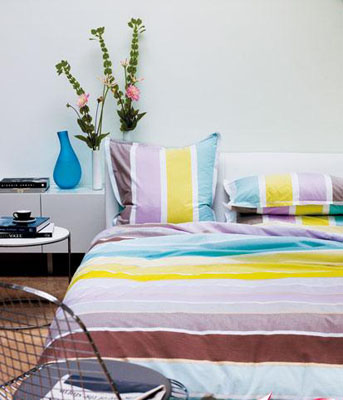 淡紫色與水藍(lán)色過(guò)渡的主調(diào)彩色條紋裝飾,使得床品整體簡(jiǎn)潔而具動(dòng)感。淡淡的色澤更迎合了春的清爽,大膽而不張揚(yáng),時(shí)尚而不傲氣。與簡(jiǎn)約的白色床頭及空間搭配和諧。配上清涼金屬條靠背椅及現(xiàn)代家具,擺放上設(shè)計(jì)感十足的花瓶裝飾,完美地打造出輕松休閑的臥室一角。