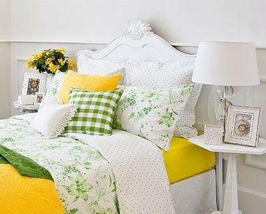 清新的綠色碎花被子,背面是綠色的小圓點圖案,加上綠色格紋的靠枕,讓人覺得淡雅宜人,此時加上金黃色的抱枕和毯子,一下子讓臥室如同沐浴在陽光中的森林一般溫馨寧靜。