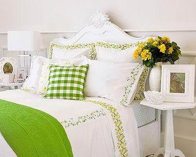 金黃色的碎花宛如少女編制的花環(huán),圍繞在被子和枕頭的邊緣,一款綠色格紋抱枕把清新的感覺烘托了出來,綠色實地的毯子更像是草坪一般展開,如同置身春日的花園,讓人神清氣爽。
