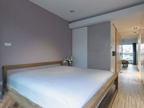 主臥房延續(xù)公共空間的簡(jiǎn)約靜白,素雅的主臥室連床框都呈現(xiàn)簡(jiǎn)約無(wú)印風(fēng),僅有咖啡磚色的墻面,淺淺的營(yíng)造臥眠區(qū)該有的柔和溫暖。