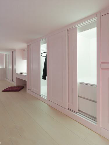 上層衣柜在柜子里頭加裝感應式燈光,方便更衣時快速找到想搭配的服飾。